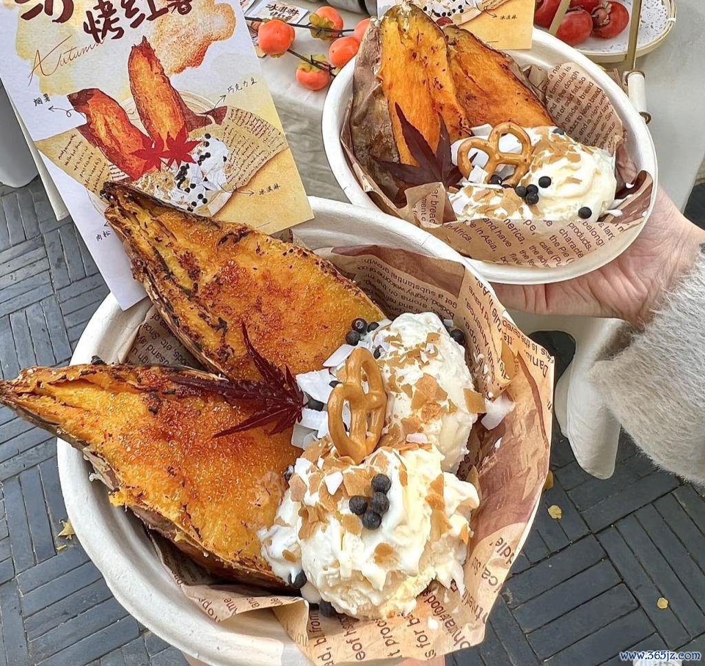 在烤得焦黑流油的红心蜜薯中间填入丝滑的冰激凌,再撒上桂花碎或焦糖脆片,一口下去,感受“冰火两重天”的好意思味。